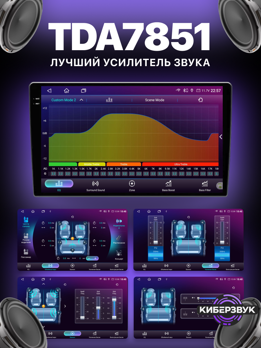 За звук отвечает усилитель TDA7851 (4×50 Вт), обеспечивающий громкое и чистое звучание. Поддерживается цифровой процессор DSP ROHM32107 с 36-полосным эквалайзером, задержками, отдельными RCA-настройками сабвуфера и фильтрами для встроенного усилителя — для тех, кто любит настраивать всё "под себя".