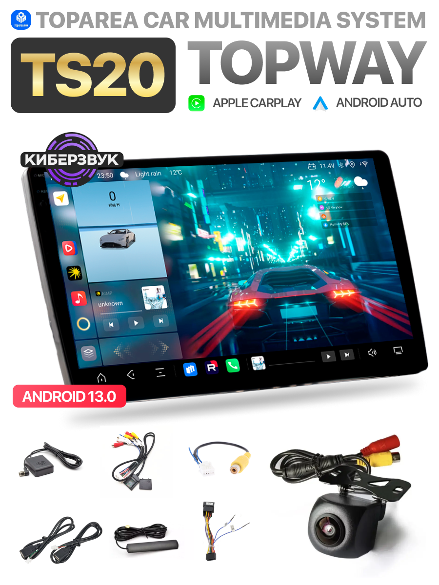 Флагманская магнитола Премиум класса Topway TS20 c 2K экраном, усилителем звука TDA7808 Mosfet, голосовым управлением (требуется активация), возможностью подключения видеорегистратора, камеры заднего вида, внешнего усилителя звука, сабвуфера и смартфонов через CarPlay и Android Auto.