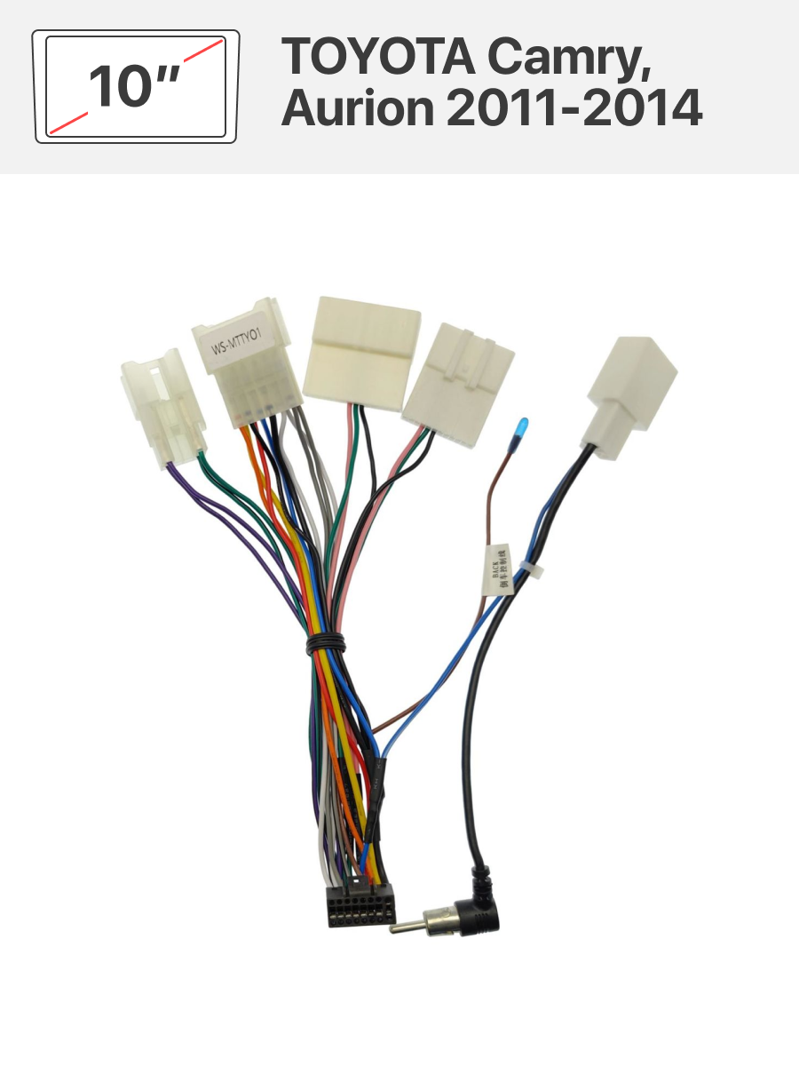 В комплекте идет переходная рамка 10 дюймов и переходник на штатную проводку для TOYOTA Camry, Aurion 2011-2014 в комплектации без штатной камеры и штатного усилителя