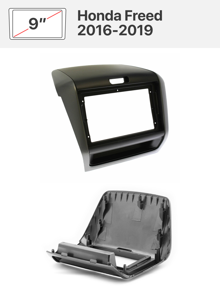 В комплекте идет переходная рамка 9 дюймов и переходник на штатную проводку для Honda Freed 2016-2019 (для подключения штатной камеры заднего вида необходимо дополнительно приобрести адаптер).
