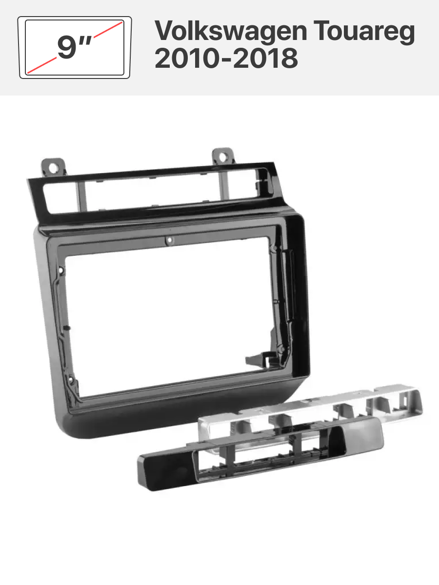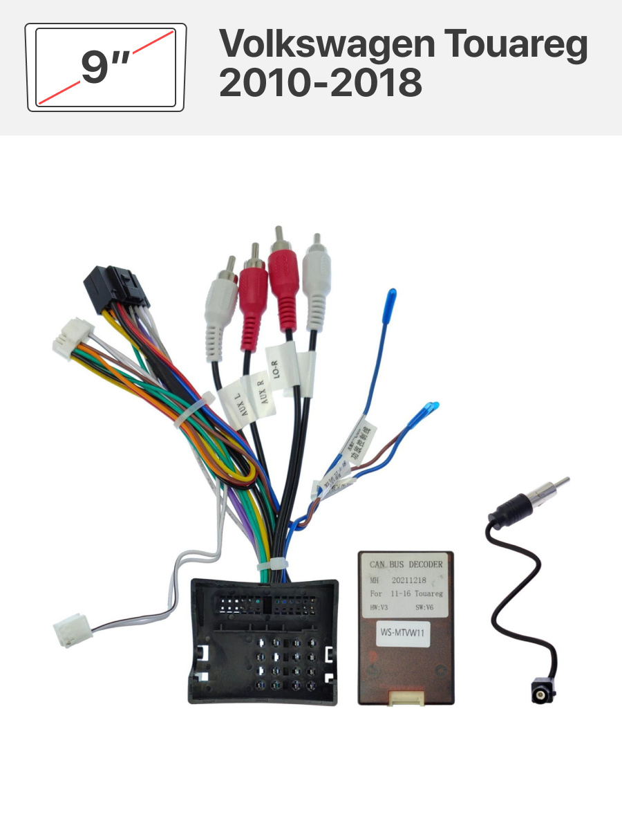 В комплекте идет переходная рамка 9 дюймов и переходник на штатную проводку для Volkswagen Touareg 2010-2018 в комплектации без штатного усилителя звука.