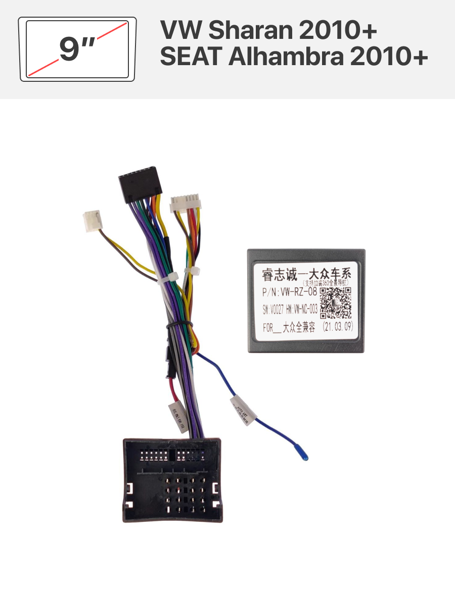 В комплекте идет переходная рамка 9 дюймов и переходник на штатную проводку для VW Sharan 2010+, SEAT Alhambra 2010+
