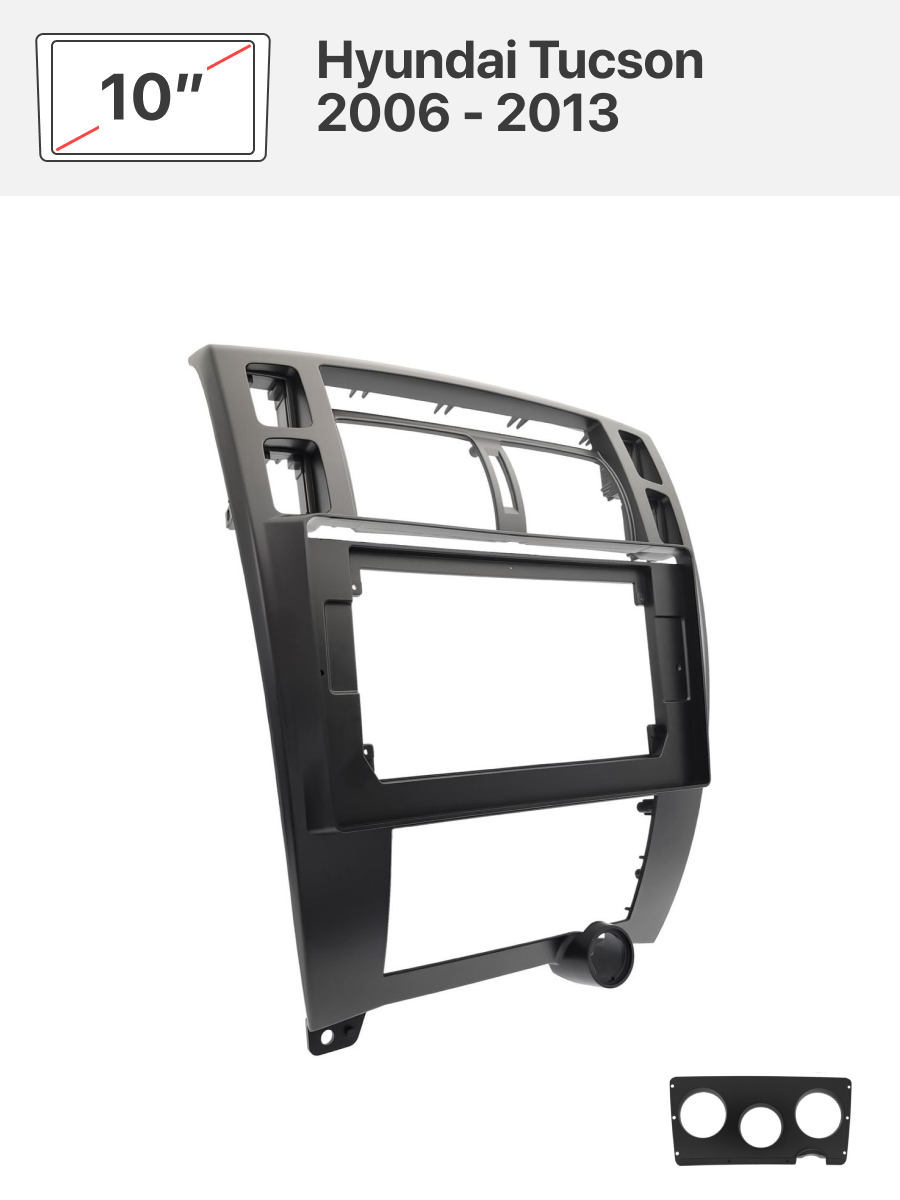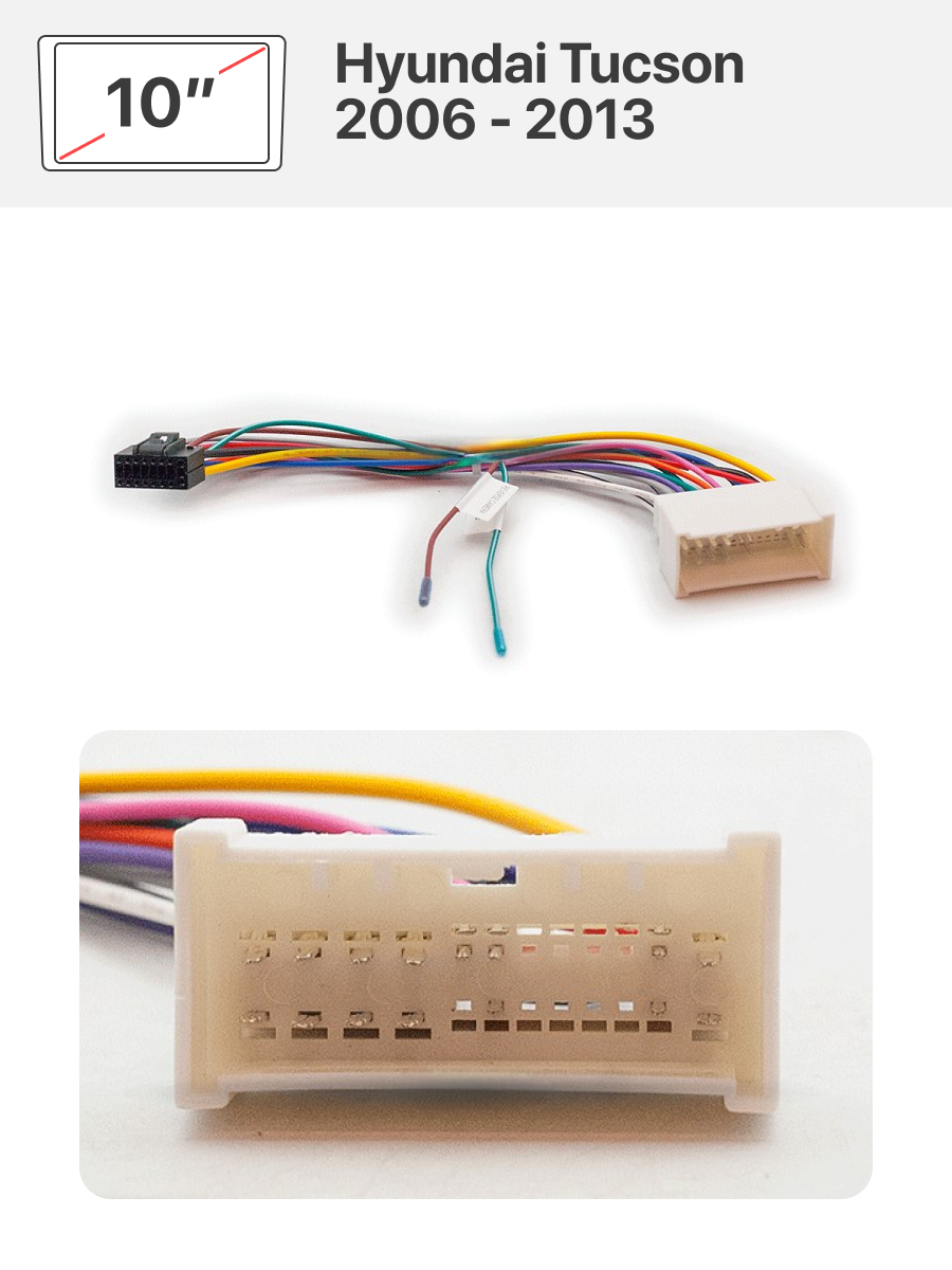 В комплекте идет переходная рамка, 10 дюймов и переходник на штатную проводку для Hyundai Tucson 2006 - 2013.